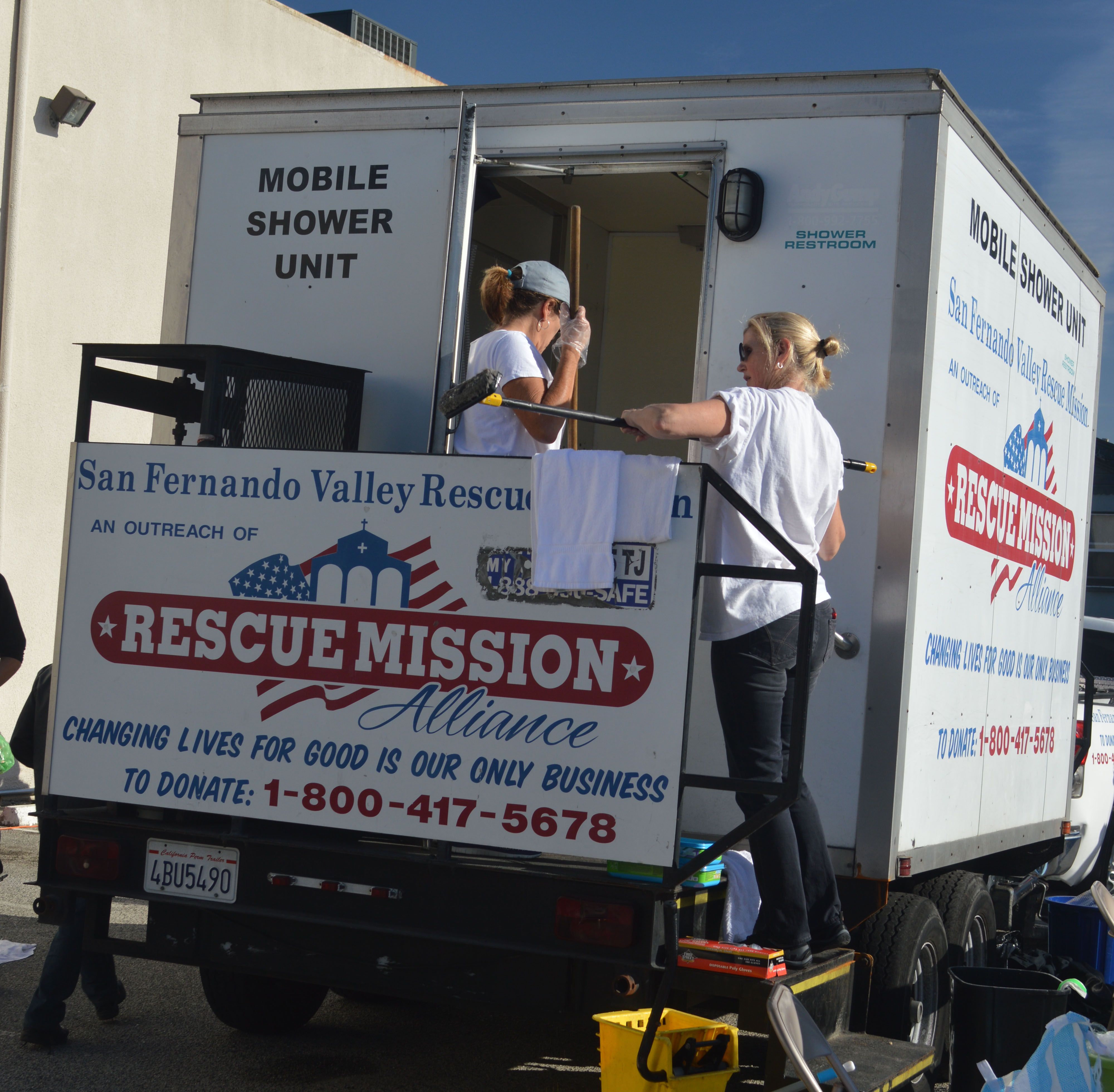 Homeless persons began lining up for the event two hours before the door opened. Once inside, they found an army of volunteers offering many different services. They were each given tickets for a meal and shower, as well as an item of clothing and pair of gently used shoes. There was a DJ and other musicians to provide a festive atmosphere to the event. They could get a haircut if desired. The Venice Family Clinic was on hand to administer flu shots, and Animal Wellness Centers provided vaccines for their pets. San Fernando Valley Rescue Mission was on hand with their portable showers. Other event sponsors included The Animal Advocacy Museum, Toni R. Price – Lash Factor Inc., Crown Plaza Hotel, The Beauty Bus Foundation, UCLA’s Creative Minds Project, REMO Recreational Music Center, Hav a Soul, Dog for Dog, Unleashed by Petco, Drippin’ Nectar Body Products, Badan Aromatherapy, Veggie Grill, Green Peas Casual Food, Hunter Best Cleaning, Momentum Biosciences, Dream Sweets Banking Co., discountmugs.com and Tofurky.